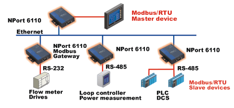 大部分的主機和新研發出來的 PLC都支持以太網接口,并都運行 Modbus/TCP協議。 NPort 6110 網關被用來連接分散的Modbus 串口設備,進行數據的采集和控制。 每個 NPort 6110都支持以太網的 Modbus/TCP 協議,允許多達7個連接。軟件配置的串行接口支持RS-232 、RS-422/485。在RS-232/422 模式, NPort 6110 可以連接 1 個串口設備,在RS-485方式下,一個NPort 6110 可以支持多達 31 串口設備。這是工廠中最普遍的應用。