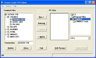 使用CIMREX FTP Client 程序和 CIMREX Tools File Transfer 程序,可將配方檔案從 EXTER 或 CIMREX 操作員人機(jī)傳輸至 PC 進(jìn)行備份或編輯 (直接在程序中或另外以 Excel 進(jìn)行編輯)。 之后,可將新的配方載入回操作員人機(jī)。 此外,也可以很輕松的將趨勢(shì)檔案從操作員人機(jī)收集到計(jì)算機(jī)上,并以不同類型的程序使用這些趨勢(shì)檔案。 列出所有傳入警報(bào)的警報(bào)清單也可以傳輸至計(jì)算機(jī)。