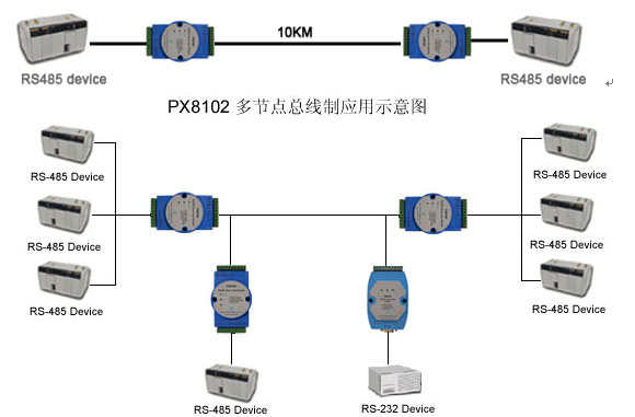 Model PX8102不僅解決RS-485點到點的超遠距離通訊,同時在以雙絞線構架的CAN總線上,其他具有RS-485接口的設備,在掛接PX8102后,可以作為CAN總線上的節點,構成CAN網絡。上位機與節點的通訊采用輪詢方式。
