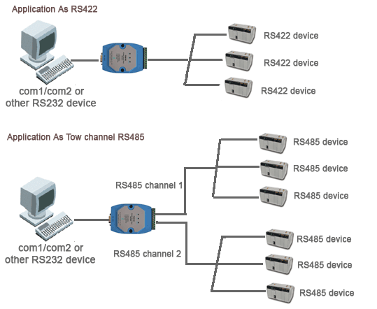 Model PX8004可作為RS-232到RS-422轉換器使用,或是作為RS-232轉2通道RS-485集線器(TwoChannel RS-485 Hub使用,通過模塊內置的跳線,來實現RS-422或是RS-485工作方式。如用戶采用RS-485總線方式,2通道RS-485集線器方式,可改善用戶RS-485網絡匹配,降低RS-485總線設備運行風險。