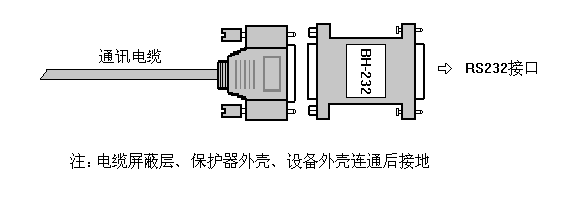 如圖所示將本保護器直接串插與RS232接口和原通訊電纜線之間即可,要求將保護器的外殼和通訊電纜的屏蔽層以及設備的外殼連通并接地。