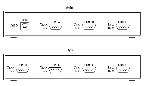 PWR :電源指示燈, USB : USB-B 型插座, Tx :數據發送指示燈, Rx :數據接收指示燈, COM A ~ G : RS232 串口插座。