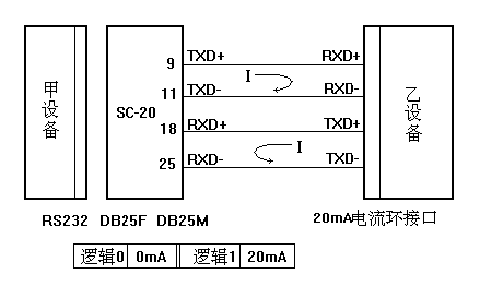 SC-20通訊轉換器用以實現RS232到TTY(20mA電流環)通訊規程之間的轉換.本產品體積小巧,不需外接電源,靠RS232可得到約20mA的輸出電流,并且不需初始化串口.外形采用DB25轉換盒.其中DB25F(孔座)一端為RS232口,直接插在25芯RS232插座上,如您的RS232插座為9芯,則在RS232插座與DB25F之間應配9-25轉換器,其對應連線如下:
