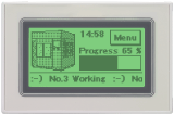 在明亮、易讀的液晶畫面上,不僅能顯示信息、圖形,還可自由顯示按鍵、指示燈、PLC數據、圖表、時鐘 等。此外,配合設備的狀況,能夠切換3色背光燈。使運行狀況一目了然。