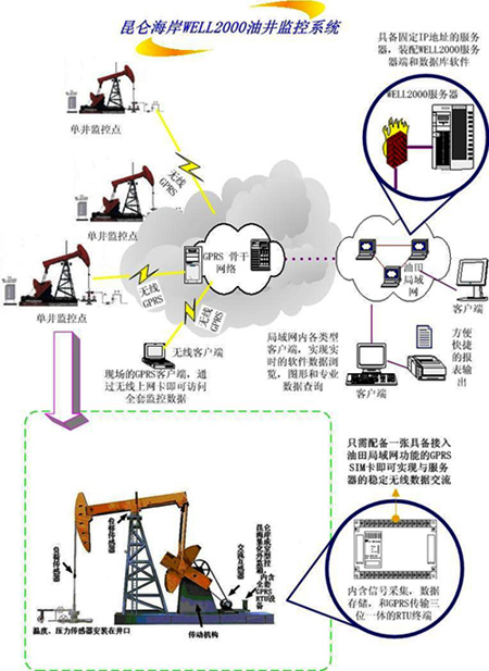 5.科學(xué)的的計(jì)算和統(tǒng)計(jì) WELL2000系統(tǒng)軟件通過(guò)油井專業(yè)分析公式計(jì)算出各類型專業(yè)數(shù)據(jù),在界面上提供專業(yè)數(shù)據(jù)報(bào)表。例:根據(jù)軟件提供的光桿功率,地面效率,可以為使用者調(diào)整電機(jī)的工作容量和參數(shù)提供可靠的依據(jù)。其他的電流平衡度,功率平衡度,功率因素,日耗電等等重要專業(yè)數(shù)據(jù)也是油井工況分析的重要指標(biāo)。 WELL2000系統(tǒng)組成 WELL2000采用多個(gè)采集點(diǎn)對(duì)服務(wù)器的模式,一個(gè)采油井配備一套WELL2000硬件設(shè)備,向RTU設(shè)備設(shè)置好目的IP地址,各監(jiān)控點(diǎn)即可獨(dú)立的與服務(wù)器端口進(jìn)行數(shù)據(jù)交流。