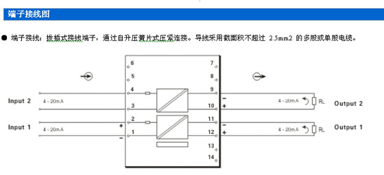 1. 適合將信號輸入隔離轉(zhuǎn)換:信號二入二出。 2. 連接至現(xiàn)場的開關設備: 有源電流信號4~20mA。 3. 連接至控制系統(tǒng)(或其它單元組合儀表): 控制系統(tǒng) DCS/PLC或其它智能儀表的 AI 接收卡。