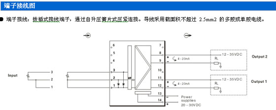 ● 接線端子 拔插式接線端子 端子標號: 輸入接線端 1、2、3、4、5、6 輸出接線端 7、8、9、10、11、12 供電電源接線端 13-、14+ 適合截面積不超過 2.5mm2 的多股或單股電纜。● 安裝方式 35mm 標準導軌卡式安裝;建議采用垂直 安裝形式(見垂直安裝圖示)。● 環境溫度濕度限制 工作運行溫度 0~+60℃ 運輸儲藏溫度 -20~80℃ 相對濕度 5~95%RH● 外形尺寸 寬(厚)×高×深=W16×H116×D110(mm) (見外形尺寸圖)● 整機重量 約110g~120g● 性能指標標準精度: ±0.1%FS溫度漂移: ±0.015%/℃響應時間: ≤1s(0 → 90%)穩定時間: ≤3s電源電壓變動影響: ±0.1%(允許電壓范圍)負載電阻變化影響: ±0.1%/250Ω通道隔離: 輸入-輸出-電源之間隔離絕緣電阻: ≥100MΩ/500V DC(AC)隔離能力: 1500VAC/1 分鐘 50Hz負載能力: ≤500Ω (電流輸出4~20mA、0~20mA)≥3KΩ (電壓輸出0~5V、0~10V)抗電磁兼容性: 符合 IEC 61000 相關抗電磁標準