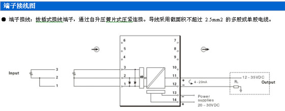 ● 接線端子 拔插式接線端子 端子標號: 輸入接線端 1、2、3、4、5、6 輸出接線端 7、8、9、10、11、12 供電電源接線端 13-、14+ 適合截面積不超過 2.5mm2 的多股或單股電纜。● 安裝方式 35mm 標準導軌卡式安裝;建議采用垂直 安裝形式(見垂直安裝圖示)。● 環境溫度濕度限制 工作運行溫度 0~+60℃ 運輸儲藏溫度 -20~80℃ 相對濕度 5~95%RH● 外形尺寸 寬(厚)×高×深=W16×H116×D110(mm) (見外形尺寸圖)● 整機重量 約110g~120g● 性能指標標準精度: ±0.1%FS溫度漂移: ±0.015%/℃響應時間: ≤1s(0 → 90%)穩定時間: ≤3s電源電壓變動影響: ±0.1%(允許電壓范圍)負載電阻變化影響: ±0.1%/250Ω通道隔離: 輸入-輸出-電源之間隔離絕緣電阻: ≥100MΩ/500V DC(AC)隔離能力: 1500VAC/1 分鐘 50Hz負載能力: ≤500Ω (電流輸出4~20mA、0~20mA)≥3KΩ (電壓輸出0~5V、0~10V)抗電磁兼容性: 符合 IEC 61000 相關抗電磁標準