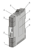 ● 結構 卡裝式構造;模塊化表芯;ABS 材質機殼;拔插式端子。 1. 輸入接線端 綠色標識,連接至現場設備 2. 電源指示燈: 儀表通電或處于正常工作狀態時燈亮 3. 輸出接線端 綠色標識,連接至控制系統或其它單元組合儀表 4. 左側機殼蓋 與儀表右面機殼緊密扣合,用合適工具可撬開 5. 電源接線端 2孔 3mm 供電電源接線 (13-/14+) 6. 透氣散熱孔 密集散熱孔,通風對流設計 7. 產品標簽粘貼部位 PET耐熱材質標簽,標注產品型號代碼 及相關重要參數 8. 右側機殼 為主體機殼構件,與左機殼蓋扣合。 9. 安裝卡口 35mm 標準 DIN 導軌卡式安裝 | |