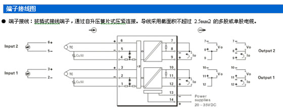 ● 接線端子 拔插式接線端子 端子標號: 輸入接線端 1、2、3、4、5、6 輸出接線端 7、8、9、10、11、12 供電電源接線端 13-、14+ 適合截面積不超過 2.5mm2 的多股或單股電纜。