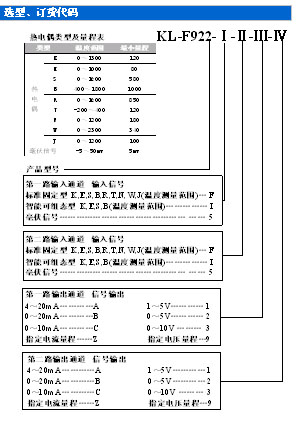 訂貨須知: 1、參照選型舉例,正確規范書寫訂貨型號代碼。 舉例(智能可組態) 輸入:1路、2路 K 0~1300℃ 輸出:1路、2路 4~20mA 訂貨代碼為:KL-F922-IIAA(K 0~1300℃)