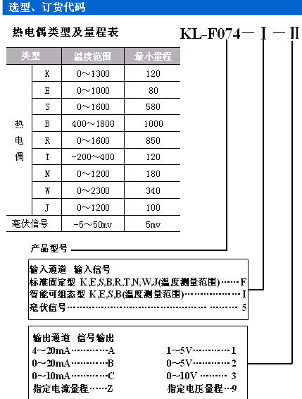 訂貨須知:1、參照選型舉例,正確規(guī)范書寫訂貨型號代碼。● 舉例1 輸入:K 0~1300℃ / 輸出: 4~20mA● 訂貨代碼為:KL-F074-FA(K 0~1300℃) 舉例2 輸入:K 0~1300℃ / 輸出: 1~5V 訂貨代碼為:KL-F074-F1(K 0~1300℃)● 舉例3(智能可組態(tài)) 輸入:E 0~1000℃ / 輸出: 0~20mA 訂貨代碼為:KL-F074-IB(E 0~1000℃)