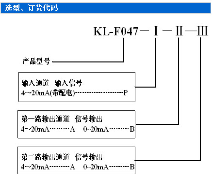 訂貨須知:1、參照選型舉例,正確規(guī)范書寫訂貨型號代碼。● 舉例1 輸入:變送器 4~20mA ● 輸出:1路4~20mA;2路4~20mA;● 訂貨代碼為:KL-F047-PAA 舉例2 輸入:變送器 4~20mA ● 輸出:1路4~20mA;2路0~20mA; 訂貨代碼為:KL-F047-PAB