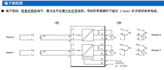 ● 接線端子 拔插式接線端子 端子標號: 輸入接線端 1、2、3、4、5、6 輸出接線端 7、8、9、10、11、12 供電電源接線端 13-、14+ 適合截面積不超過 2.5mm2 的多股或單股電纜。