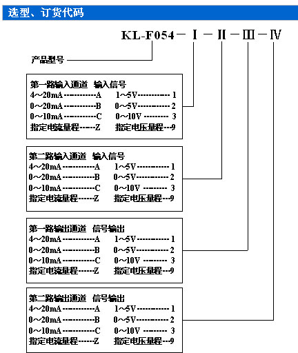 訂貨須知: 1、參照選型舉例,正確規范書寫訂貨型號代碼。 ● 舉例1 輸入: 1路4~20mA;2路4~20mA ● 輸出:1路4~20mA;2路4~20mA ● 訂貨代碼為:KL-F054-AAAA 舉例2 輸入: 1路4~20mA;2路 1~5V; ● 輸出: 1路4~20mA;2路 1~5V; 訂貨代碼為:KL-F054-A1A1