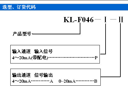 訂貨須知:1、參照選型舉例,正確規范書寫訂貨型號代碼。● 舉例1 輸入:變送器 4~20mA ● 輸出:4~20mA● 訂貨代碼為:KL-F046-PA 舉例2 輸入:變送器 4~20mA ● 輸出:0~20mA 訂貨代碼為:KL-F046-PB
