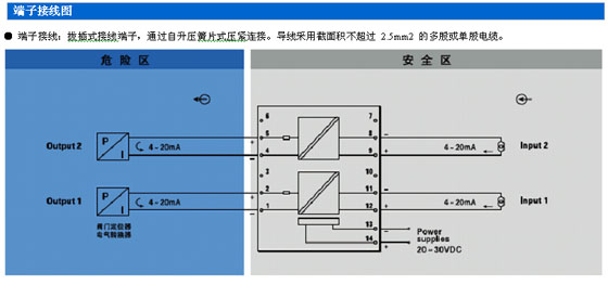 本隔離式安全柵需要獨立供電,供電電源-輸入回路- 輸出回路之間電磁隔離。 ● 驅動危險現場本安設備,負載可高達750Ω。 ● 4~20mA輸入,隔離輸出4~20mA。 ● 模塊化表芯設計,無需零點和滿度調節。 ● 帶有工作電源指示燈。 ● 雙通道,二入二出,本安輸入回路[Exia]IIC,輸入 回路過流保護。 ● 即插即拔式接線端子,DIN導軌卡式安裝。