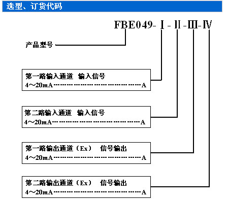 訂貨須知: 1、參照選型舉例,正確規范書寫訂貨型號代碼。 舉例1: 輸入: 1路 4~20mA;2路 4~20mA 輸出: 1路 4~20mA;2路 4~20mA 訂貨代碼為:FBE049-AA AA