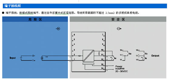 本隔離式安全柵需要獨(dú)立供電,供電電源-輸入回路- 輸出回路之間電磁隔離。 危險(xiǎn)現(xiàn)場(chǎng)的各種本安設(shè)備的直流信號(hào)輸入。 ● 標(biāo)準(zhǔn)模擬信號(hào)電隔離。 ● 可選擇4~20mA或1~5V信號(hào)輸出,或其他所需 的直流信號(hào)。 ● 模塊化表芯設(shè)計(jì),無(wú)需零點(diǎn)和滿度調(diào)節(jié)。 ● 帶有工作電源指示燈。 ● 單通道,一入一出,本安輸入回路[Exia]IIC,輸入 回路過(guò)流保護(hù)。 ● 即插即拔式接線端子,DIN導(dǎo)軌卡式安裝。 |