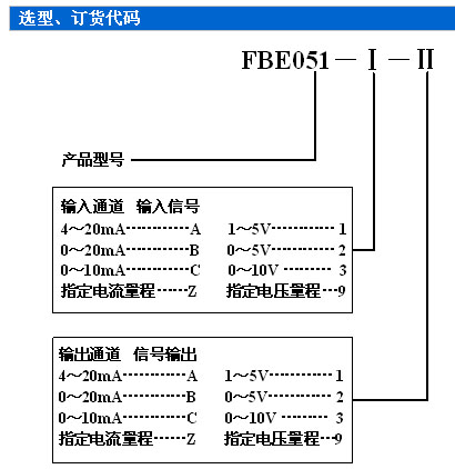 訂貨須知: 1、參照選型舉例,正確規(guī)范書(shū)寫(xiě)訂貨型號(hào)代碼。 舉例1: 輸入: 4~20mA 輸出:4~20mA 訂貨代碼為:FBE051-AA 舉例2: 輸入: 4~20mA 輸出:0~5V 訂貨代碼為:FBE051-A2