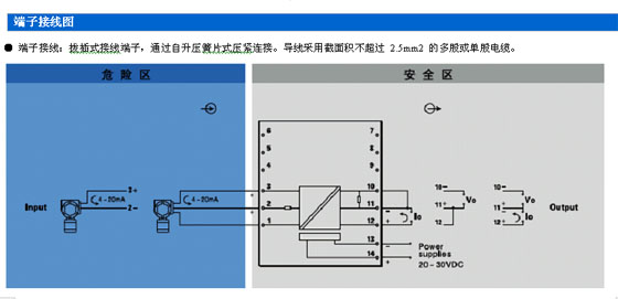 本隔離式安全柵需要獨立供電,供電電源-輸入回路- 輸出回路之間電磁隔離。 ● 給變送器提供配電電壓16.5~28V。 ● 將變送器4~20mA信號隔離傳送。 ● 可選擇4~20mA或1~5V信號輸出,或其他所需 的直流信號。 ● 模塊化表芯設計,無需零點和滿度調節。 ● 帶有工作電源指示燈。 ● 單通道,一入一出,本安輸入回路[Exia]IIC,輸入 回路過流保護。 ● 即插即拔式接線端子,DIN導軌卡式安裝。