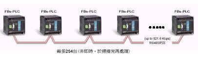 利用Port1~Port4之任一個Port之RS485界面,可作永宏PLC間多達254臺之Link,僅需于主站使用一個CLINK指令即可達成,最高通訊速度可達921.6Kbps,適用于作分散式資料搜集等,非實時控制需求之應用(PLC內部任何資料均可Link交換,非實時更新,占用較少PLC CPU時間