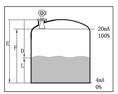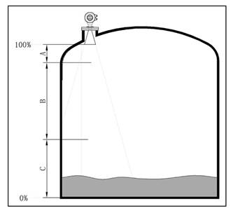 - 若介質(zhì)為低介電常數(shù)當其處于低液位時,罐低可見,此時為保證測量精度,建議將零點定在低高度為C 的位置。