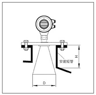 - 如果喇叭直徑大于安裝短管的直徑,包括延伸管在內(nèi)的天線需要從容器里面安裝,并將儀表抬高。選擇延伸管使儀表至少抬高100mm。