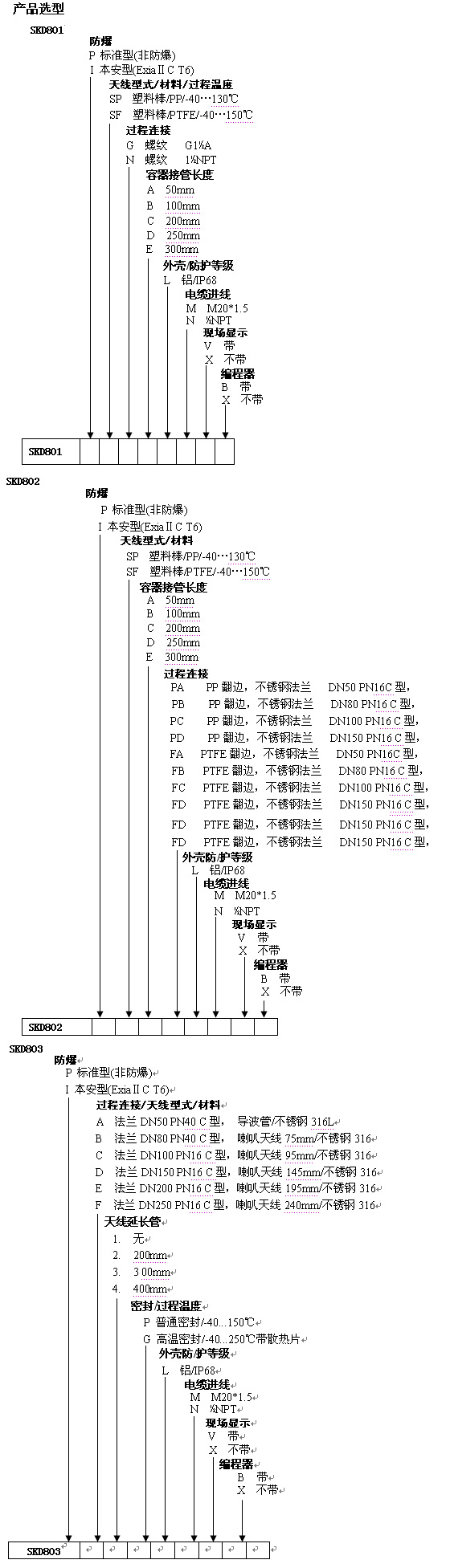 過程連接 SKD801 (PP,PTFE天線) :G1-1/2 316L不銹鋼,: SKD802(棒式天線) :翻邊法蘭DN50,DN80,DN100,DN150 SKD803(喇叭口形式天線):法蘭DN50,DN80,DN100,DN150,DN200,DN250