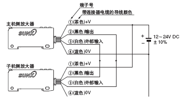 ①將主機側放大器的設定復制模式設為復制發(fā)信ON后按MODE按鈕,待數字顯示屏上顯示“ ”后設為復制預備狀態(tài)。有關設定方法,請參閱操作指南。 ② 切斷主機側放大器的電源。 ③如下圖所示,對主機側放大器和子機側放大器進行配線。 |