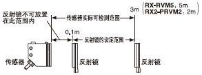 注: 回歸反射型傳感器的檢測距離是對反射鏡RF-230的值。而且,RX-PRVM3,RX-RVM5和RX2-PRVM2的檢測距離是反射鏡可以設定的范圍。傳感器可檢測 0.1m以內的物體。