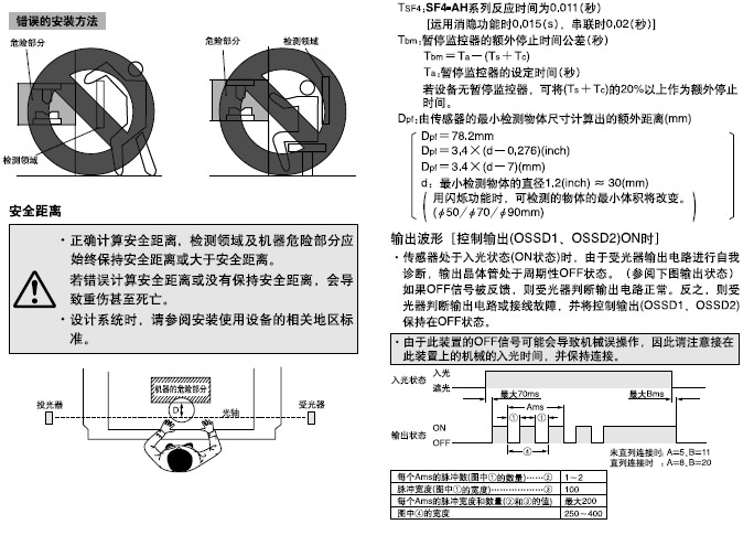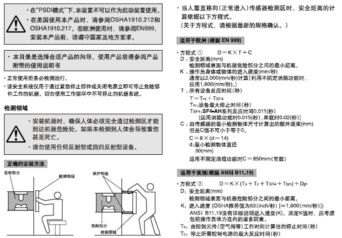 安全距離的計(jì)算要求簡化因?yàn)橐堰_(dá)到了一個與光軸數(shù)無關(guān)的11ms的高速反應(yīng),所以不再需要計(jì)算每個獨(dú)立傳感器的安全距離。這個高速反應(yīng)簡化了整個安全距離計(jì)算的程序。提高了安全距離反應(yīng)速度,使得危險區(qū)域與傳感器之間的距離縮短,從而實(shí)現(xiàn)設(shè)備的小型化。