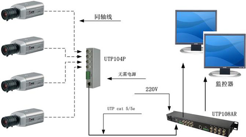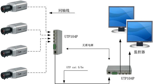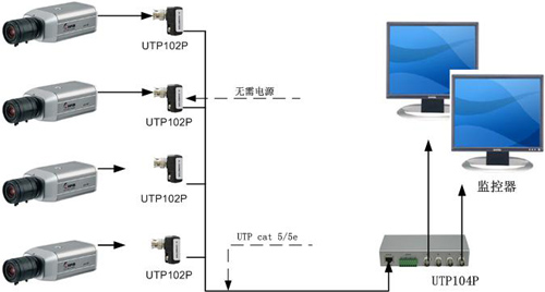 在實際工程中,UTP104P既可以當發射器,也可以當接收器使用,可傳輸4路視頻、音頻或控制信號,傳輸距離為0-300米,雙絞線質量好時可達600米以上。UTP104P也可以與UTP101AR、UTP104AR、UTP108AR配對使用,傳輸距離在600-900米。UTP104P干擾抑制及抗電磁輻射能力較強,可以在各種干擾情況較復雜的環境里使用,并且也不對外界產生電磁干擾,是相當環保和經濟的。同時,五類或五類以上非屏蔽雙絞線中共有的4對線,每一對線都可以傳輸一路信號,可以使電話、RS485控制數據、音頻、多路視頻甚至低壓電源共纜傳輸。