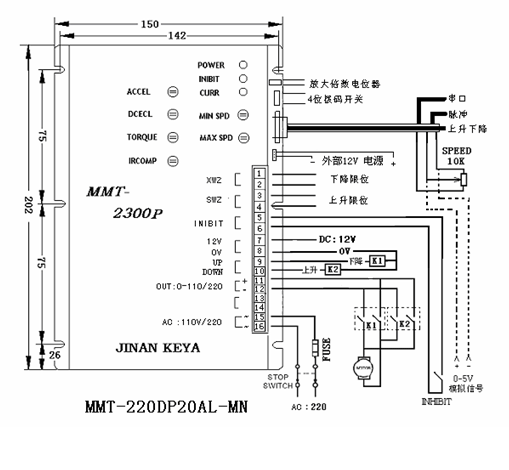 產(chǎn)品描述:該產(chǎn)品是專為試驗(yàn)機(jī)行業(yè)所設(shè)計(jì)的一款產(chǎn)品,與220DP20AL不同的是:在原有產(chǎn)品功能上又增加了多種功能,包括:232串口通訊、頻率控制、正/反向控制、下限位、上限位等功能