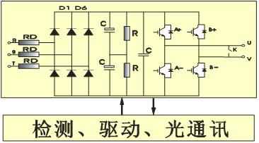 AMB-HVI系列高壓變頻器每相由六個的功率單元串聯而成。各功率單元具有完全相同的結構,有互換性。每個功率單元為三相輸入,單相輸出的交直交PWM電壓源型逆變器結構,同時還包括驅動、保護、監測、通訊等組件組成的控制電路,其結構如圖2所示。通過控制IGBT的工作狀態,輸出PWM電壓波形。每個功率單元額定輸出電壓為580V,串聯后輸出相電壓3480V,線電壓達到6kV。