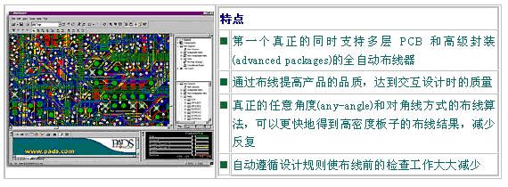 PADS AutoRouter(BlazeRouter) 使用推擠和 rip-up/retry 技術,使得布線的結果能夠既能夠達到質量的要求,又能夠具有美觀的線型。總線和具有連續性的信號能夠在元件之間平滑地布線,具有整齊的布線效果和最少的過孔。