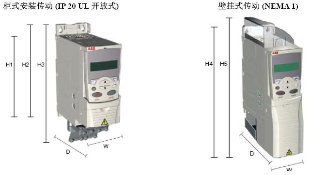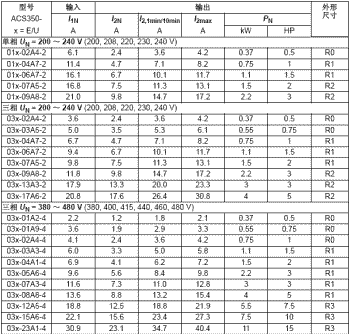 型號代碼(上述及右表第四列)清楚地表明了傳動的功率額定值和外形規格。選定型號后,外形規格(第五列)可用來確定傳動尺寸,詳情見下頁所示。 電壓 ACS350提供兩種電壓范圍: 2 = 200 - 240 V 4 = 380 - 480 V 根據所選定的電壓,在上述的型號代碼中填寫 結構 上述型號代碼中的EMC濾波器連接情況。可根據需要進行選擇,具體如下: 01 = 單相 03 = 三相 E = EMC濾波器連接,50 Hz頻率 U = EMC濾波器斷開,60 Hz頻率 需要使用濾波器時,可方便地接通。 型號代碼中的X表示E或U。 |