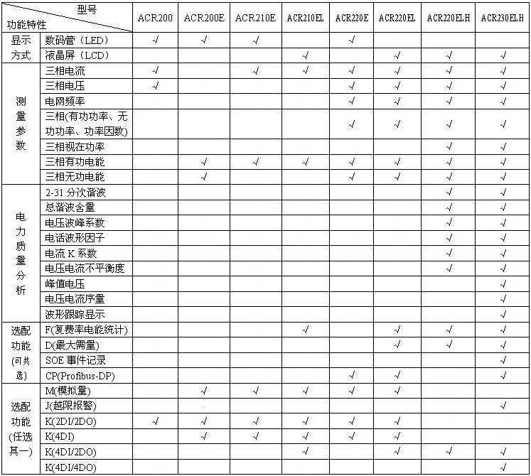 2、ACR200、ACR200E、ACR210E(L)、ACR220E(L)在選配K(4DI)功能時具備1路有功電能脈沖信號輸出端口,在選配K(2DI/2DO、4DI/2DO)功能時無脈沖信號輸出端口;
