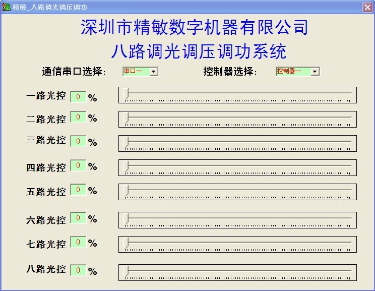 軟件安裝后,連上串口線即可正常運行;在軟件界面的八路燈光調節窗口,拖動鼠標即可實時控制八路可控硅的導通角從而控制輸出點的實際電壓,用鼠標拖動燈光亮度設定條時,可實現燈光亮度從0%-100%的調節;此時左側顯示燈光亮度的實際百分值。