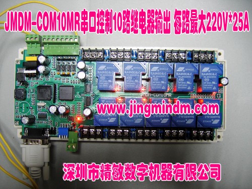 JMDM-COM10MR是一款深圳市精敏數字機器有限公司自主研發的一款具有高可靠穩定性的工業單片機數字量串口控制器,可用于10路25A大負載的開關控制,如燈光、發熱絲、電源開關、強電開關等大功率器件等;同時可采集4路開關量輸入信號,可接光電式,電容式,電感式,霍爾式等各種傳感器和輸入開關,方便很多工業或民用應用場合的行程開關、紅外開關等信號檢測或條件輸入,來控制輸出動作。產品具有如下特征: