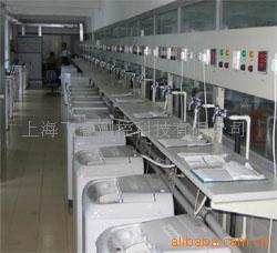 工位系統(tǒng)包括啟動、停止按鈕、運(yùn)行指示燈、報(bào)警指示燈、電參數(shù)表,帶漏電保護(hù)的空氣開關(guān)、接觸器、洗衣機(jī)專用水龍頭以及上排水管、下排水口等。工位系統(tǒng)共有48個(gè)工位,分5個(gè)排位,第一二三排位各12個(gè)工位,第四五排位各6個(gè)工位,可同時(shí)進(jìn)行測試。排位一二三四可以選擇四種水源:常溫水、常溫軟化水、熱水或熱軟化水,排位五除了可以選擇這四種水源外,還可以選擇調(diào)溫水。每個(gè)排位水源選擇互相獨(dú)立,即各排位可以同時(shí)選擇不同水源進(jìn)行試驗(yàn)。每種水源進(jìn)實(shí)驗(yàn)室的水管上裝有壓力變送器和溫度傳感器,溫度和壓力值通過顯示儀表在排位柜上顯示出來。同時(shí)變頻器根據(jù)用水量的大小自動調(diào)整轉(zhuǎn)速,使室內(nèi)出水壓力保持在一個(gè)設(shè)定值,可以最大限度的節(jié)約能源,保護(hù)水泵,延長水泵的使用壽命。裝置可根據(jù)被測機(jī)器的要求選擇不同的電源(220V/50Hz;110V/50Hz,110V/60Hz等等)。