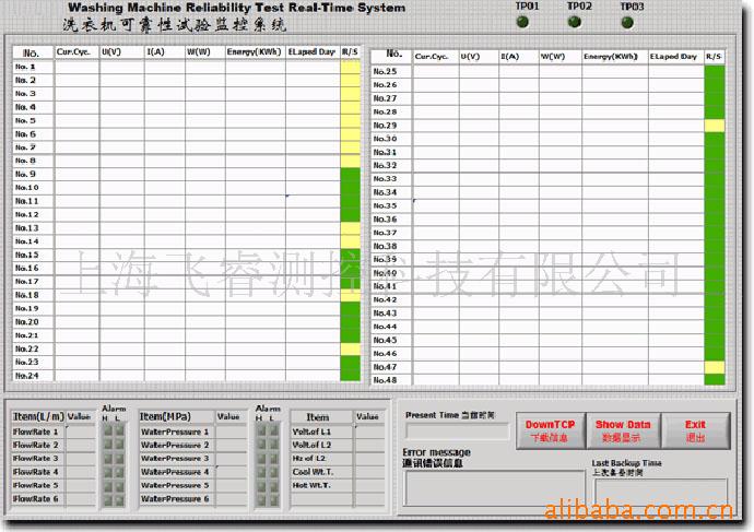 用NI公司的LabVIEW 7.1配合NI的NI PXI-1042 8-Slot,NI PXI-8105,NI PXI-4072,NI PXI-2575,NI PXI-6225,測量各工位的電壓、電流、功率,對洗衣機(jī)運(yùn)行狀況進(jìn)行長期監(jiān)測,實(shí)現(xiàn)其壽命測試。