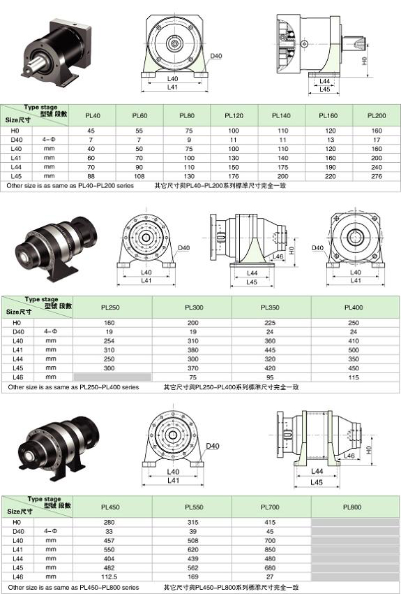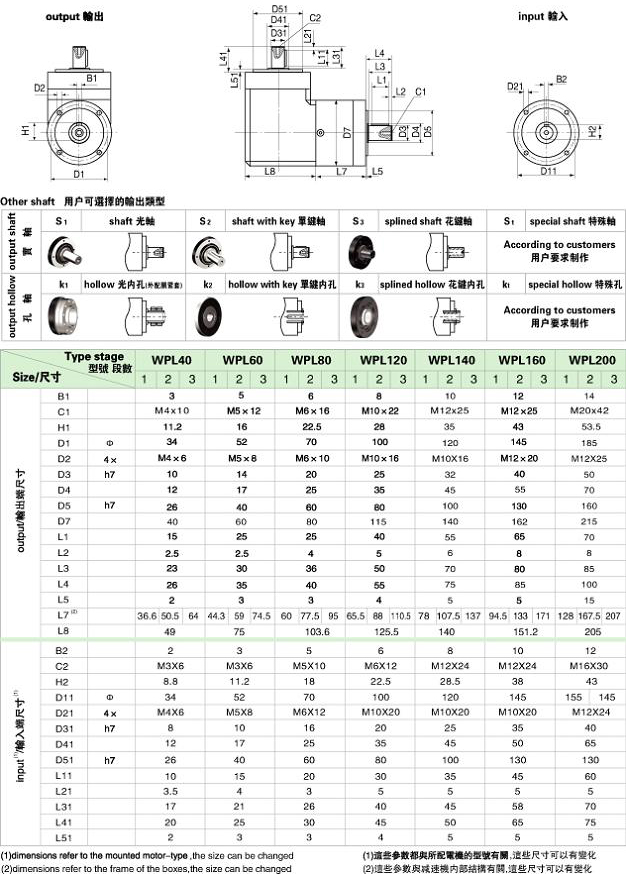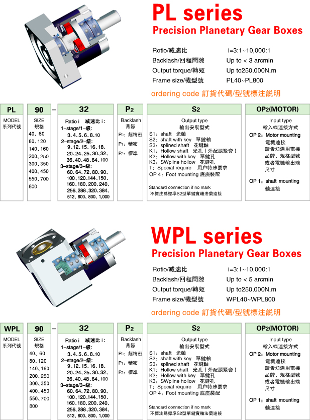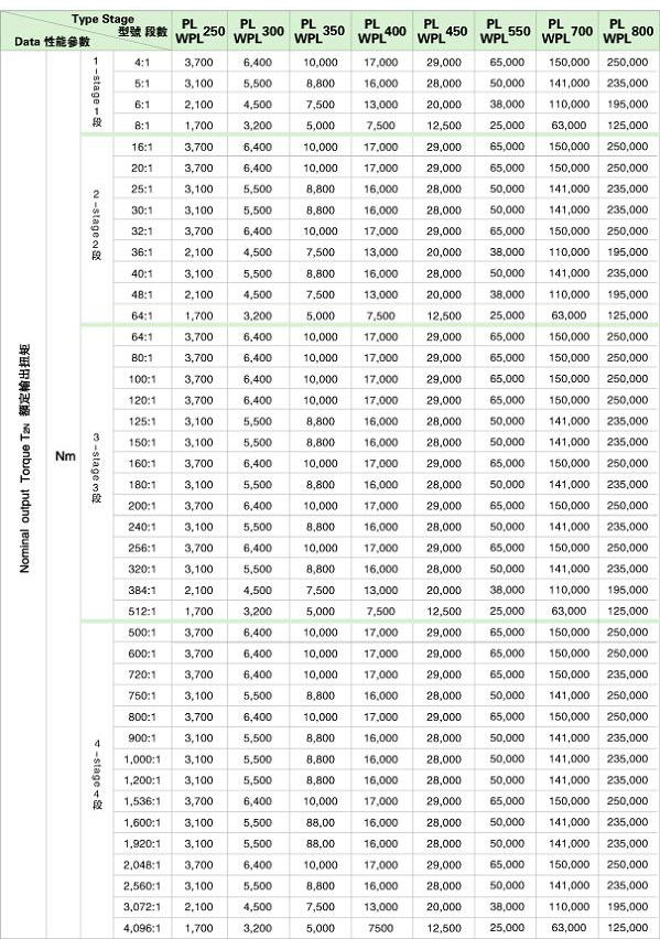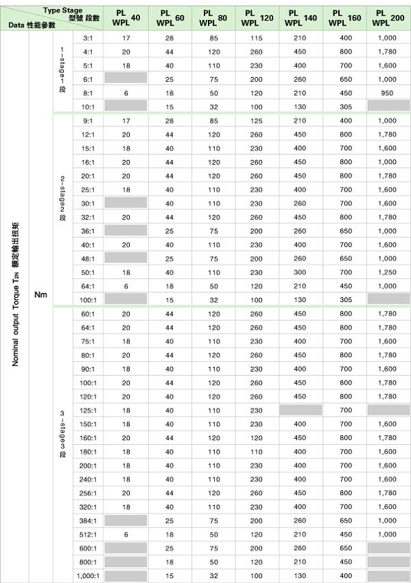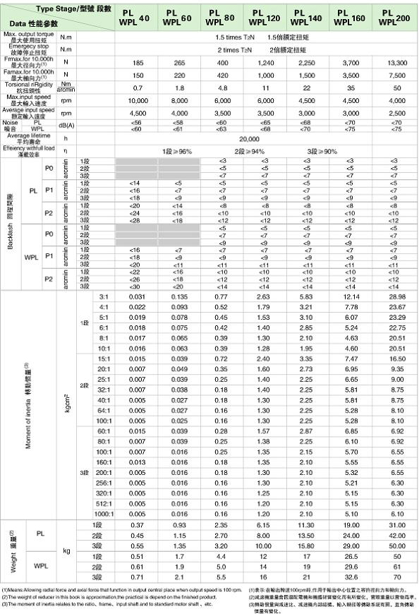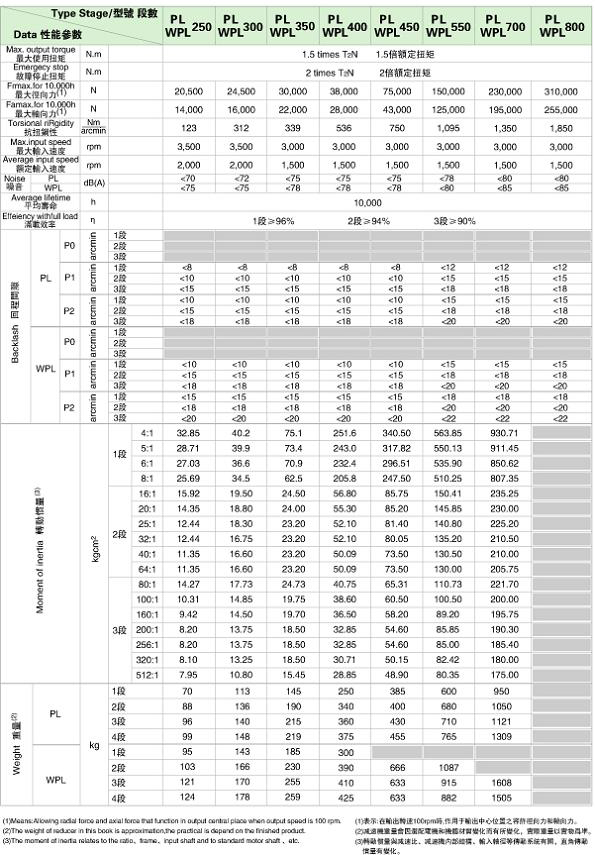 PL/WPL precision planetary gear boxes technical data PL/WPL 系列精密行星減速機技術參數 |