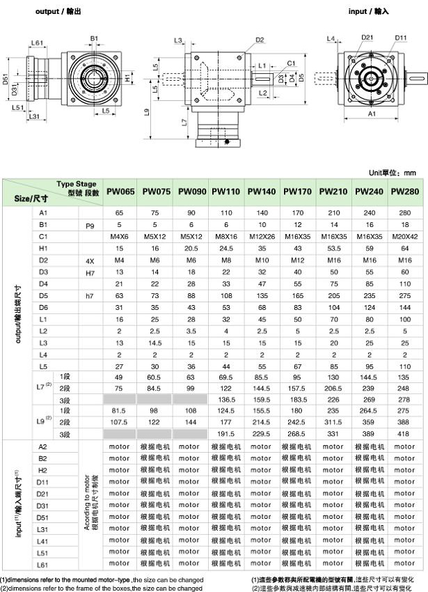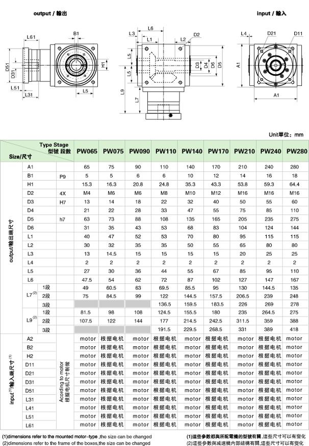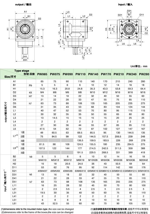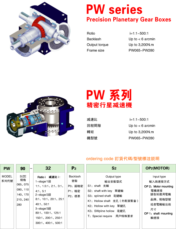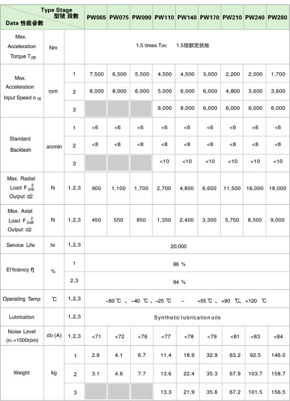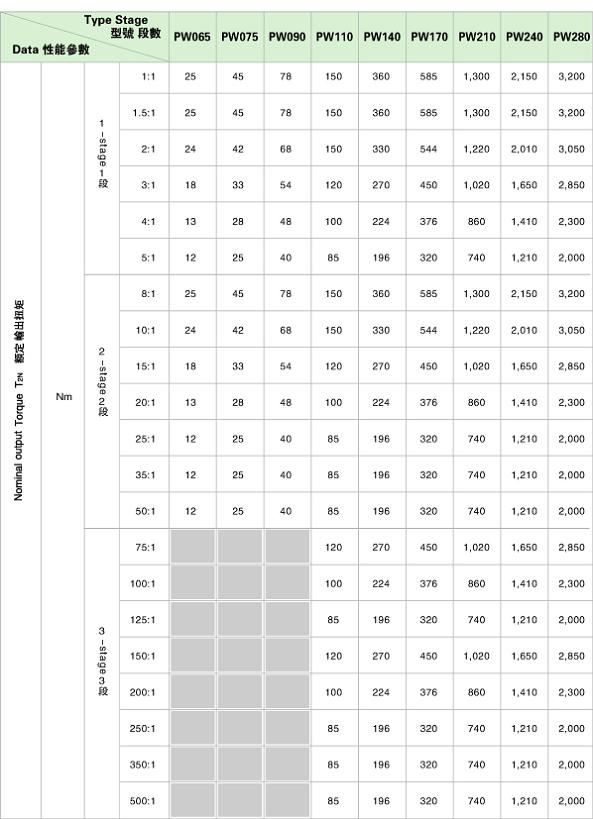 PW precision planetary gear boxes technical data PW 系列精密行星減速機技術參數 |