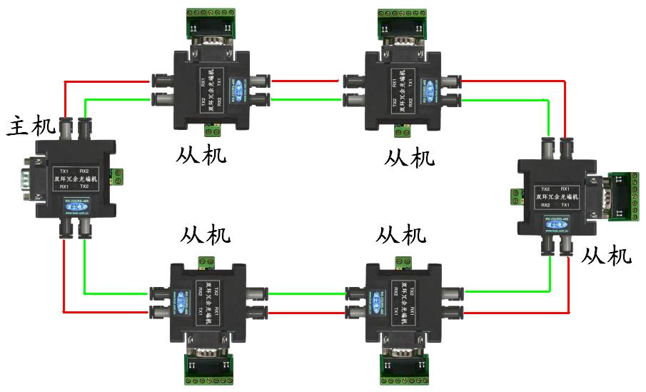 OPT14HUB星形光纖組網多機通信圖 OPT22雙環光纖組網多機通信圖