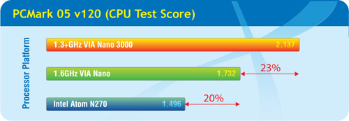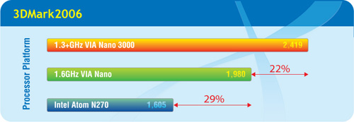 以下為威盛凌瓏,威盛凌瓏 3000 及 Intel Atom 處理器的評測結果: