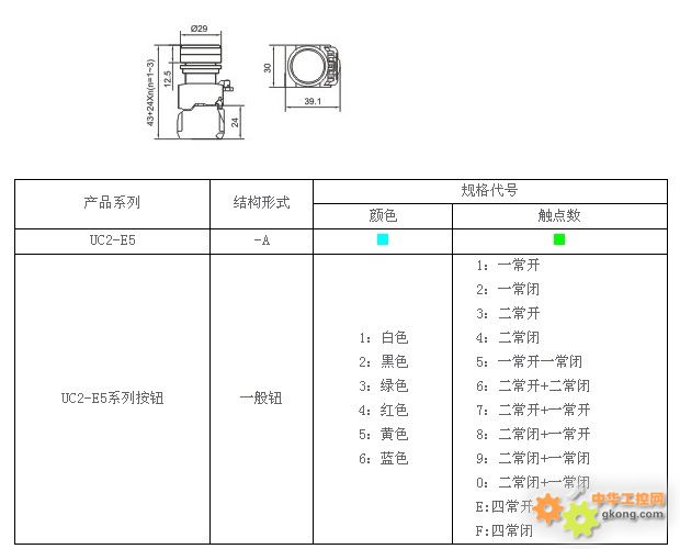 1.第1個“■”填寫顏色。 2.第2個“■”填寫常開常閉的觸頭數代碼。 3.型號舉例: 產品型號 顏色 觸點數 UC2-E5-A21 黑色 一常開 UC2-E5-A32 綠色 一常閉 UC2-E5-A43 紅色 二常開