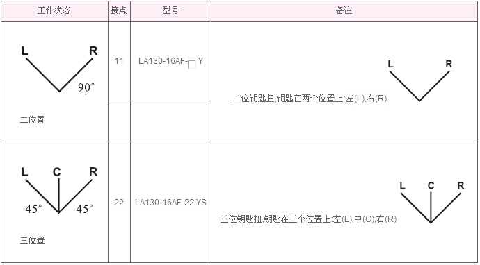 3.三位置鑰匙鈕鑰匙取出位置有兩種類型:(1).鑰匙在中間位置可拔出;(2).鑰匙在三個位置均可拔出。