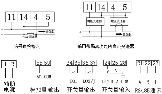 儀表可具有RS-485 通訊接口,采用Modbus-RTU 協議;可帶模擬量輸出、繼電器報警輸出、開關量輸入/輸出。根據不同要求,通過儀表面板按鍵,對變比、報警、通訊、開關量輸出進行設置與控制。