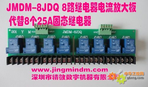JMDM-8JDQ是由深圳市精敏數字機器有限公司自主研發的一款工業級高可靠的8路大功率繼電器輸出電流放大板,簡稱為8路繼電器放大板,無需編程,直接外接在各類PLC、單片機開關量I/O控制器數字量輸出端,可代替8個固態繼電器,即可實現通過8路數字量低電平信號輸入來控制對應8路繼電器輸出,即實現了低壓數字量信號(DC12V、DC24V)變為寬電壓范圍(交流或直流0~220V,最大電流25A)的數字量信號,適用于各種大功率輸出的控制場合,如燈光、電源開關、電熱絲通斷、電機啟停等控制場合。